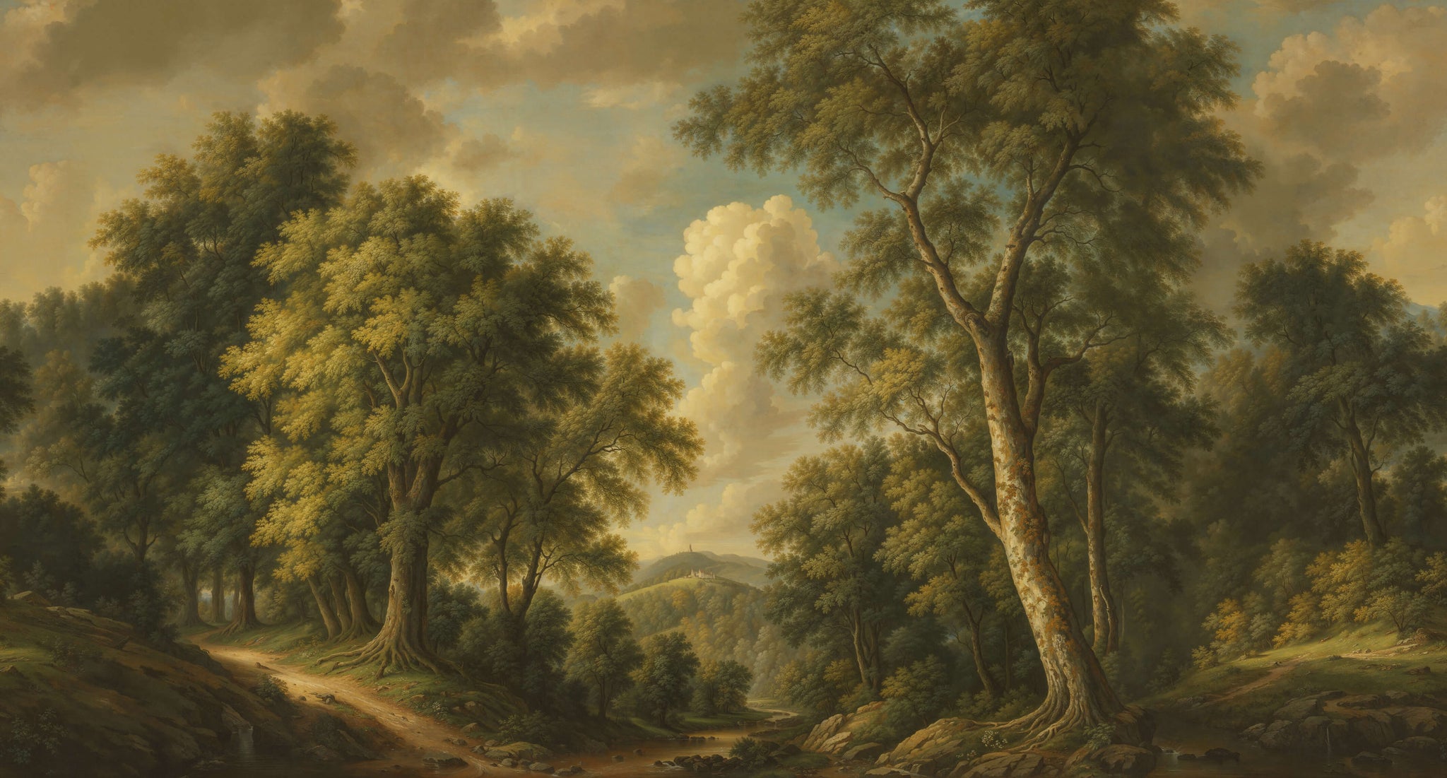 The Antique Landscape Wallpaper Mural captures the warmth and grandeur of a golden age of landscape painting, bringing a sense of timeless elegance to any interior. The scene unfolds along a winding woodland path that leads the eye towards distant hills and a softly glowing horizon. Towering trees frame the view, their branches layered with leaves in gentle shades of green, gold and amber. The soft interplay of light and shadow across the forest floor creates a feeling of depth and tranquillity, while the distant sky glows with delicate clouds that drift through the afternoon light.