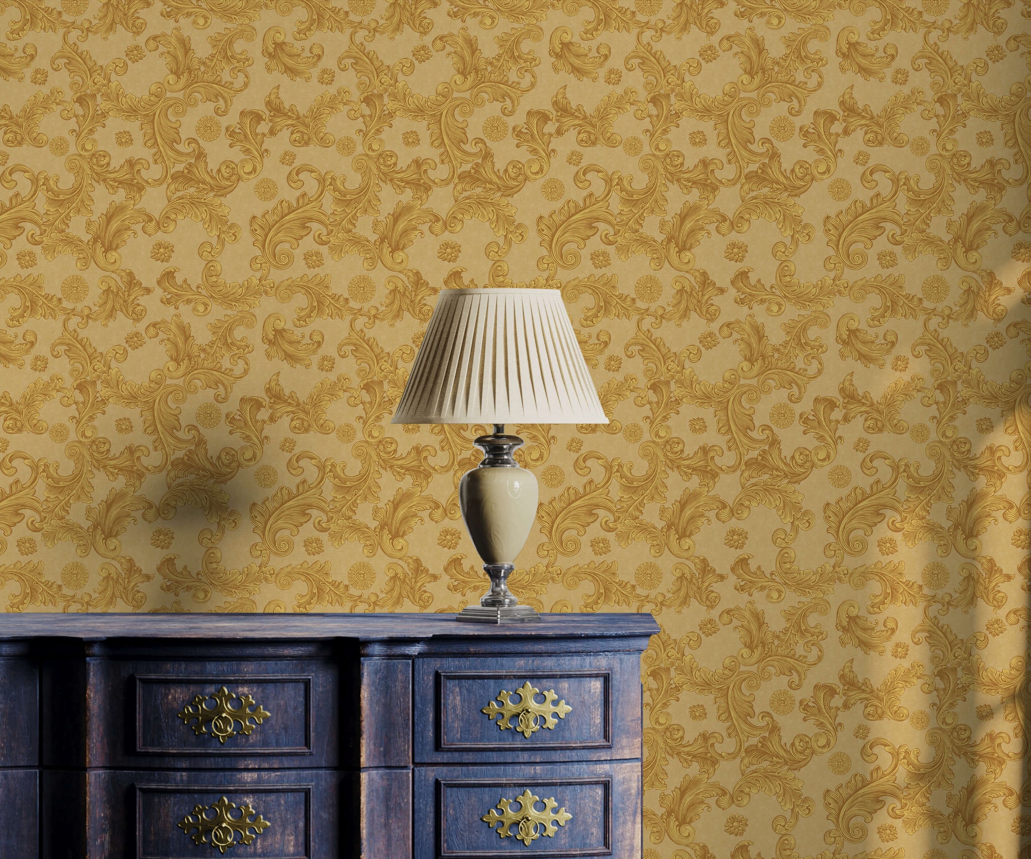 The complexity of the gold baroque damask wallpaper ensures the wall covering is a central feature of any room, providing a continuous flow of movement and artistic detail. It is a perfect choice for adding dramatic weight, texture, and a sense of aristocratic heritage to dining rooms, drawing rooms, or any space intended to feel refined and deeply traditional. The layered design catches the light beautifully, enhancing the three-dimensional look of the baroque artistry.
