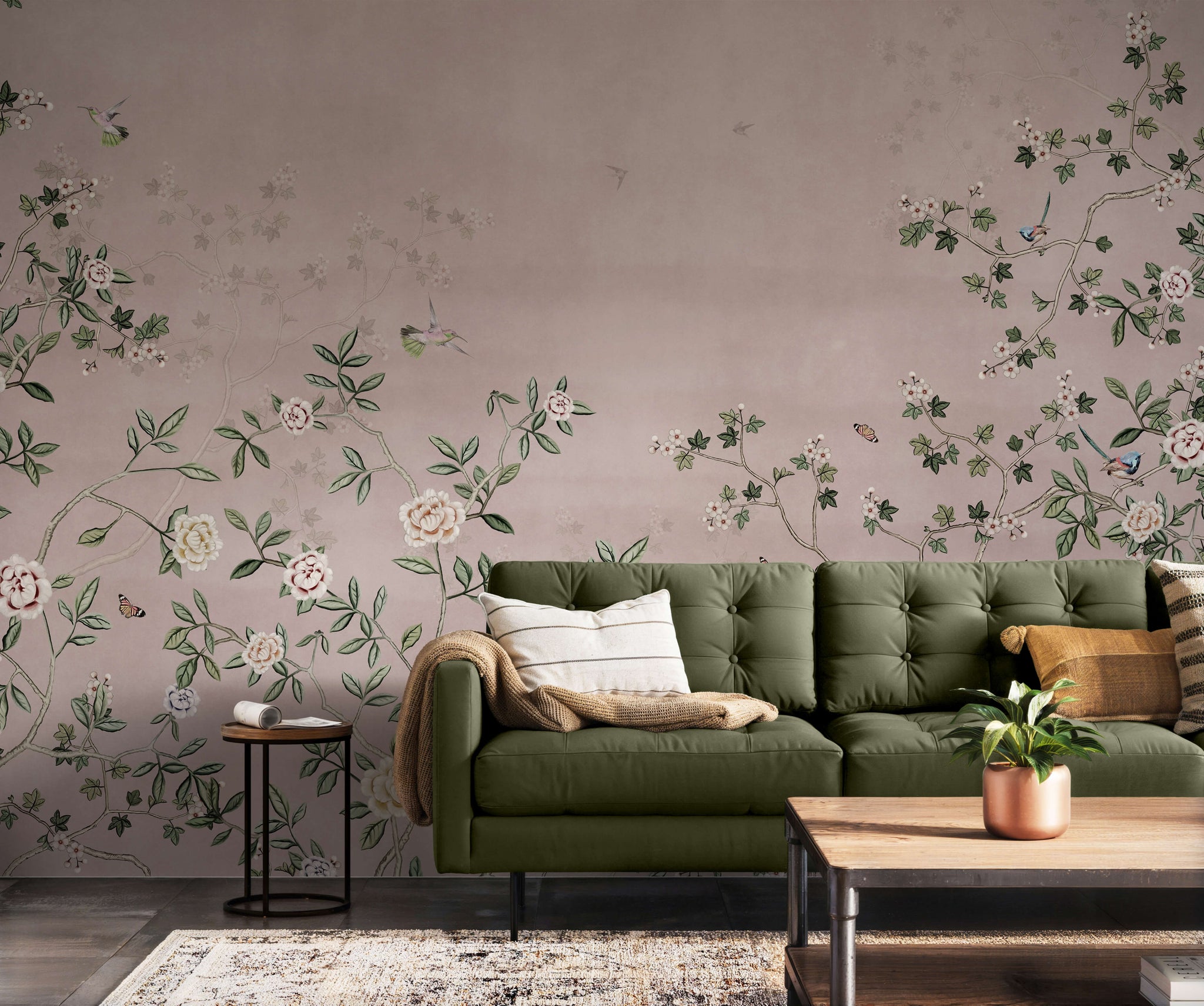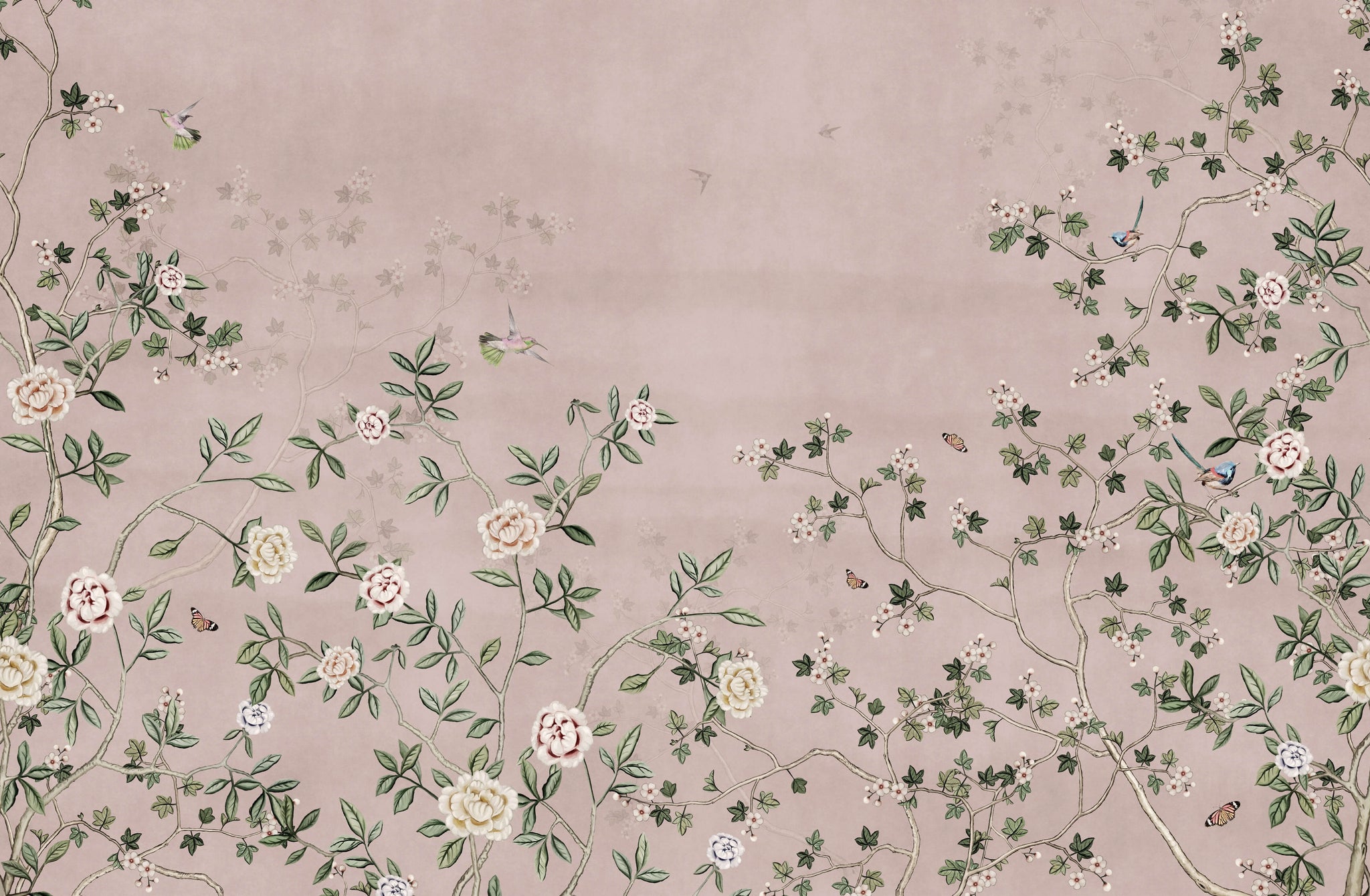 This exquisite chinoiserie wallpaper mural invites the timeless beauty of a blooming oriental garden into your home with a soft, contemporary twist. Set against a sophisticated dusty rose background with a subtle, parchment-like texture, the design features winding, slender branches adorned with delicate white and cream blossoms. Playful hummingbirds and butterflies are scattered throughout the scene, adding a sense of movement and life to the tranquil botanical composition.