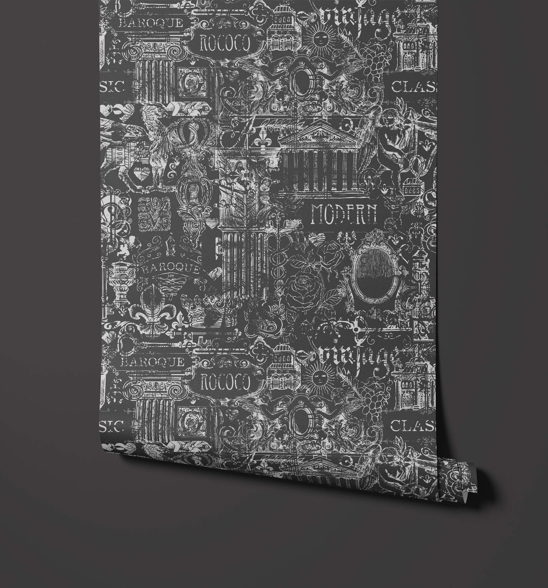 Élevez votre espace avec la grandeur opulente de notre papier peint baroque, disponible en noir et bleu. Les détails complexes rendent hommage au style baroque classique, tout en apportant une touche graphique grunge.