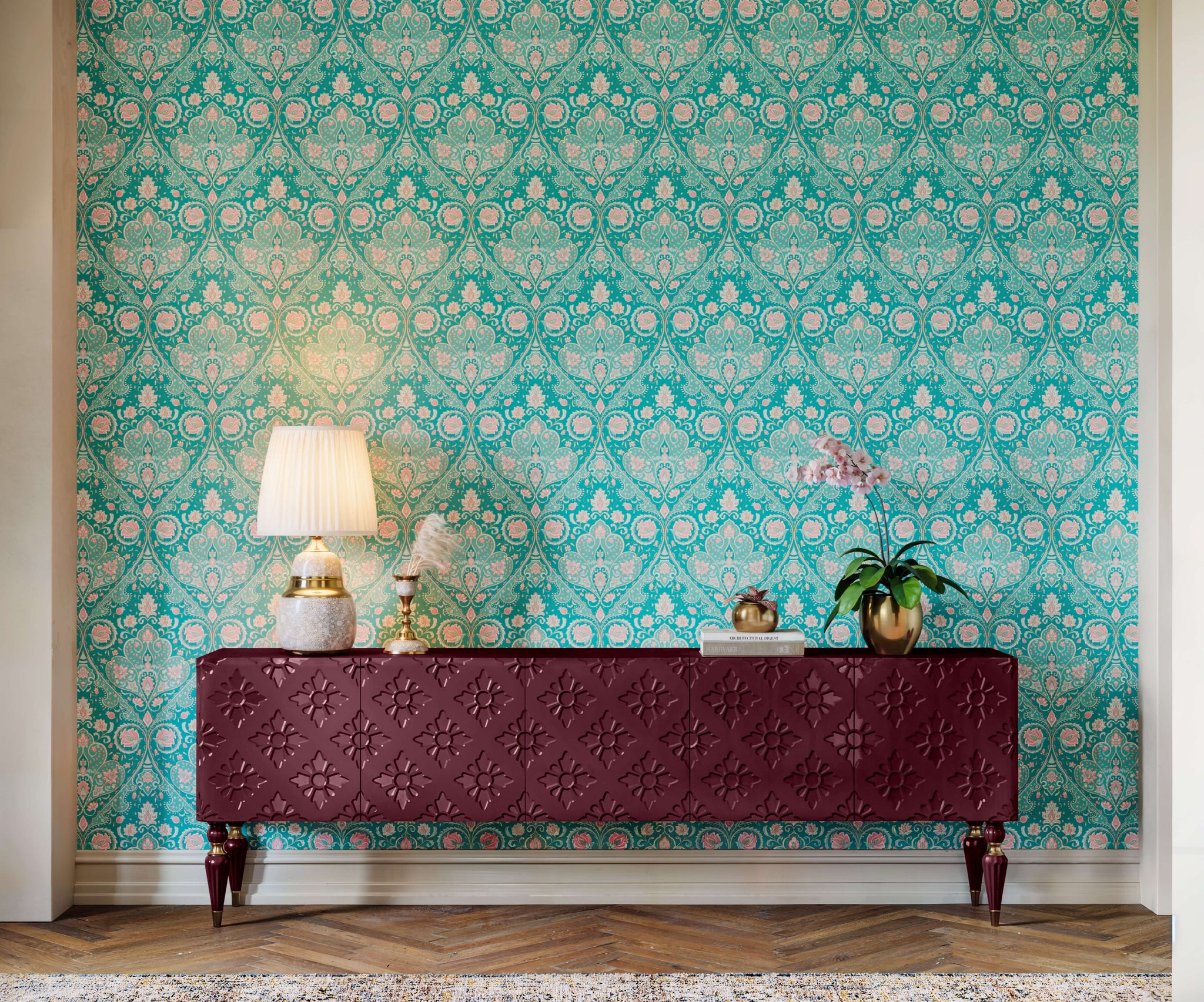 Le papier peint indien lumineux donne vie à un motif vibrant et complexe, célébrant le riche héritage culturel de l'art indien. Les motifs ornementaux audacieux tourbillonnent sur la surface, remplis de motifs floraux détaillés et de formes délicates inspirées du paisley qui s'entrelacent dans un rythme exubérant mais harmonieux. Chaque élément semble avoir été méticuleusement fabriqué, reflétant l'énergie vibrante et l'artisanat détaillé associés aux motifs indiens traditionnels. La palette de couleurs vives ajoute une touche de chaleur et de joie, ce qui en fait un point de mire éblouissant pour n'importe quelle pièce. Idéal pour ajouter une touche de luxe exotique et d'élégance ludique, ce papier peint indien lumineux transforme n'importe quel espace en un environnement vivant et accueillant. Parfait pour ceux qui apprécient les motifs audacieux et la richesse culturelle, ce papier peint apporte une touche de charme mondial et d'éclat festif dans les salons, les chambres à coucher ou les murs d'accent, où une déclaration de couleur et de design peut vraiment briller.
