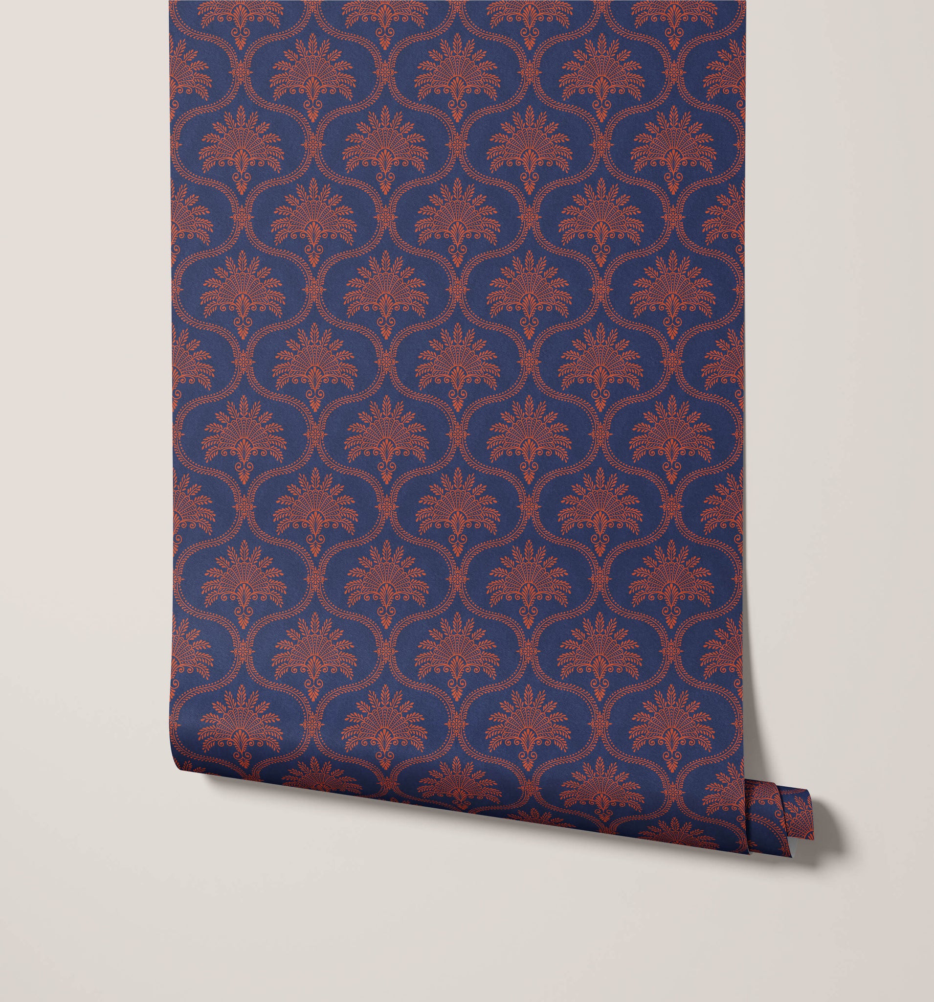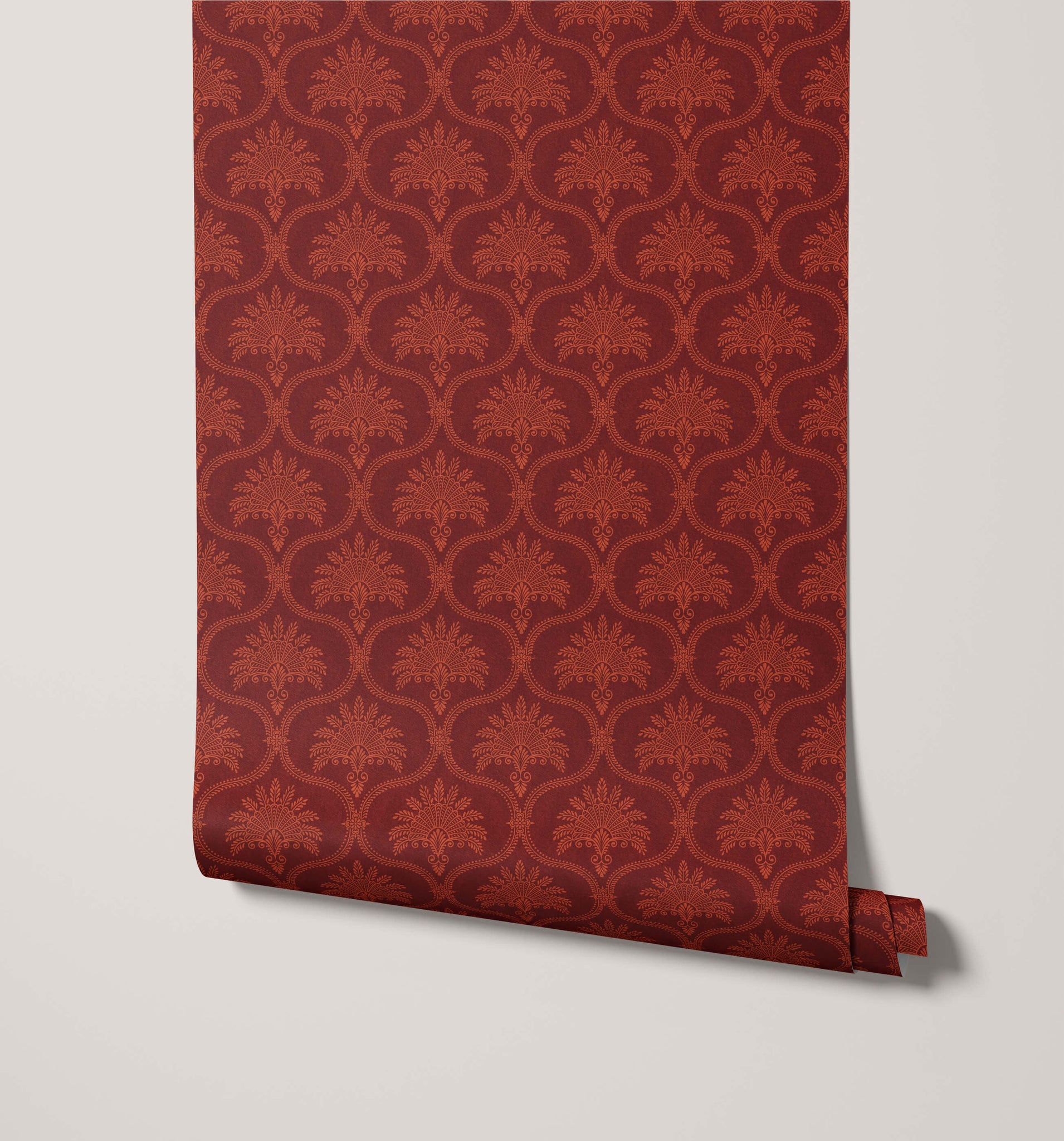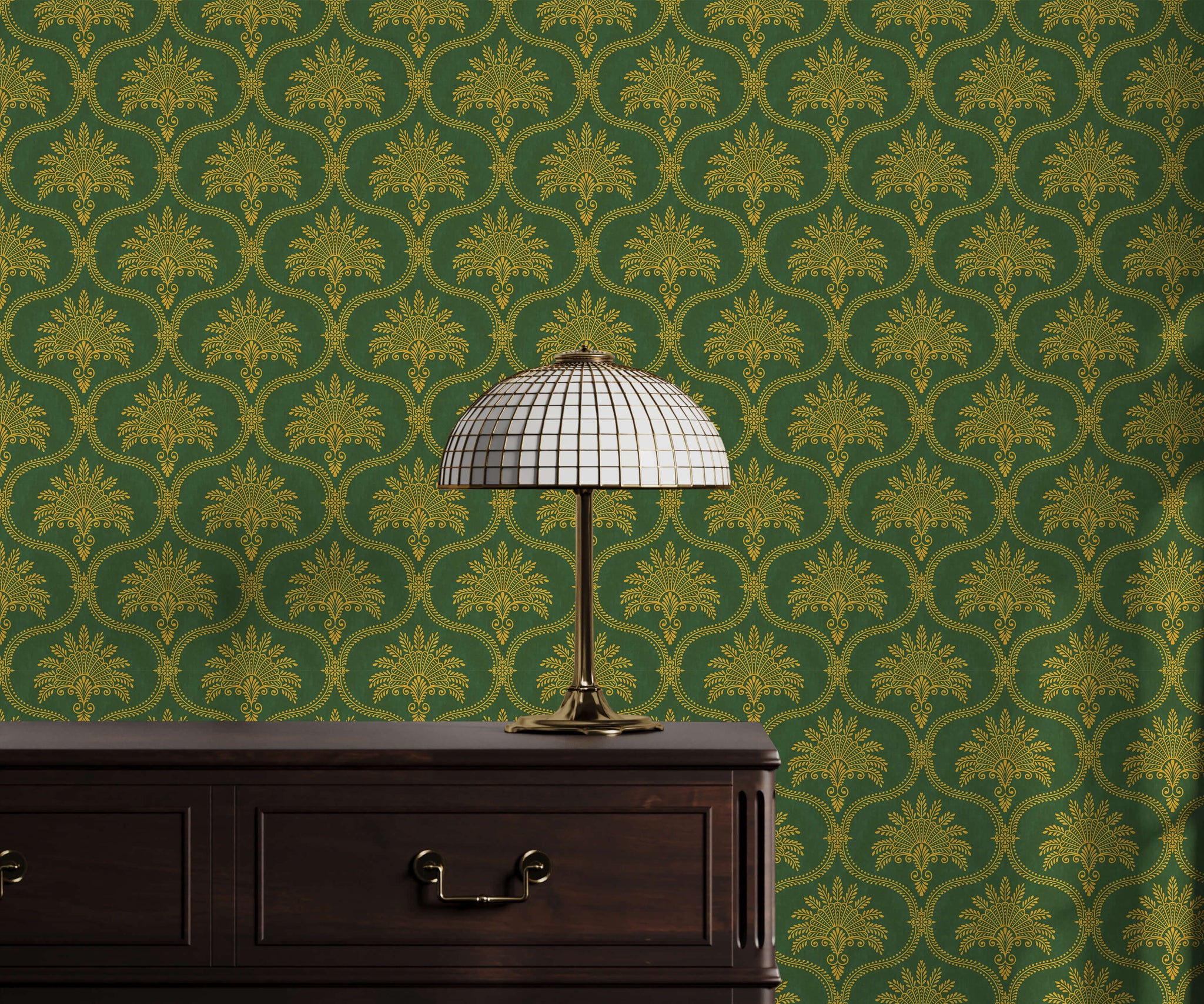 Le papier peint ornemental vintage est un motif riche et travaillé qui apporte immédiatement une sensation de luxe historique et de texture profonde à une pièce. Le dessin présente une structure continue en ogive, à l’intérieur de laquelle se trouve un motif détaillé en éventail, composé de points délicats et de feuillages stylisés. Cette construction élaborée et répétitive crée un fort effet de tapisserie couvrante.