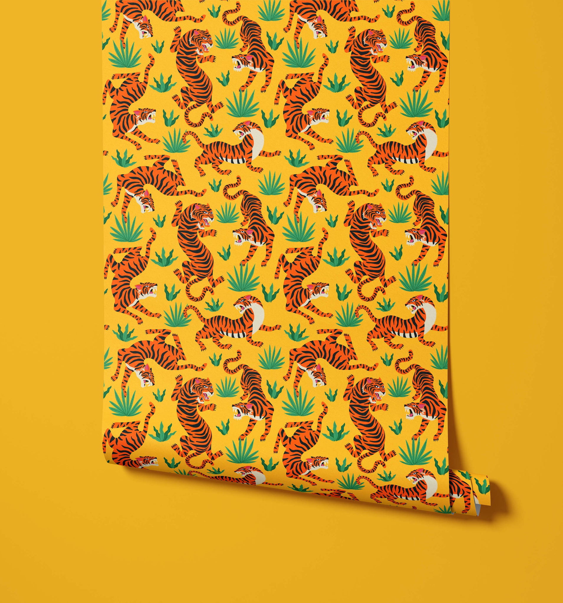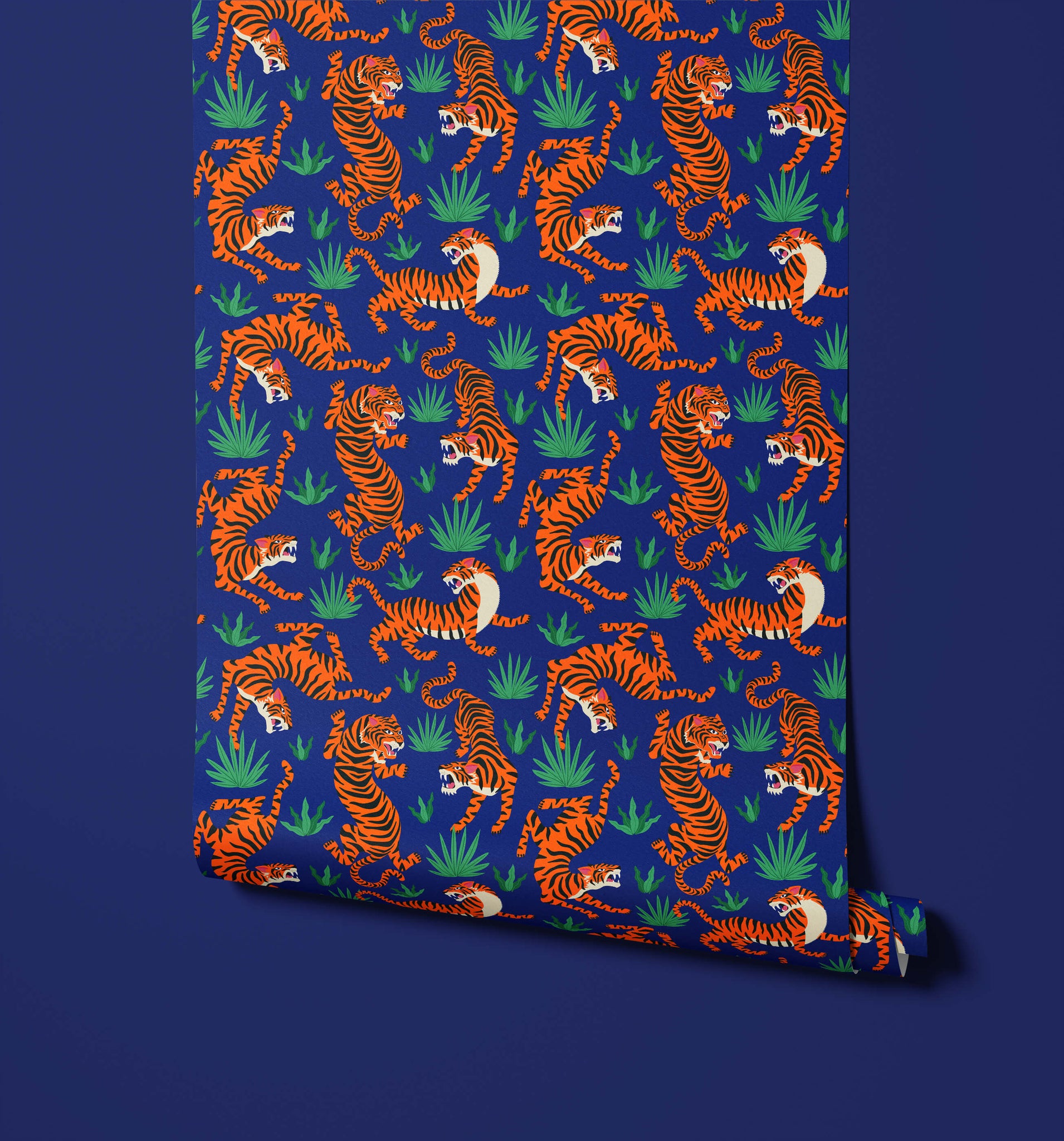 Notre papier peint tigre oriental est audacieux et sans concession. Il est conçu pour ceux qui aiment le maximalisme et veulent incorporer un sens de la jungle tropicale dans leur espace. Il est disponible dans une variété de teintes percutantes et ne manquera pas d'ajouter un point de discussion frappant à votre espace.