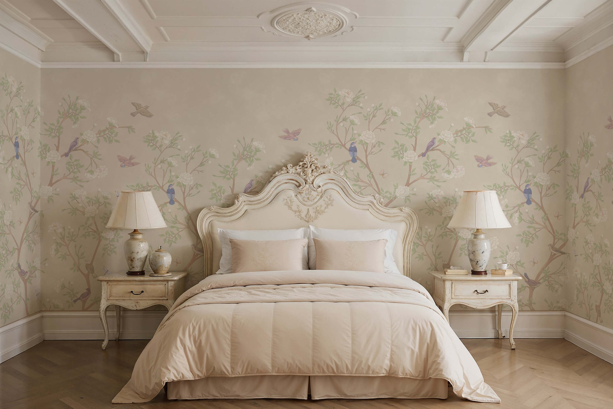 Transform your space with this bold floral wallpaper mural, bursting with vibrant charm and whimsical detail. Featuring a lively scene of blooming white blossoms, delicate green foliage, and colourful birds in shades of blue, purple, and chestnut, this mural captures the joyful essence of spring. Butterflies and dragonflies dance among the branches, adding movement and magic to the design. Set against a warm neutral background, the bright botanical elements pop beautifully, making it a perfect statement piece for feature walls.
