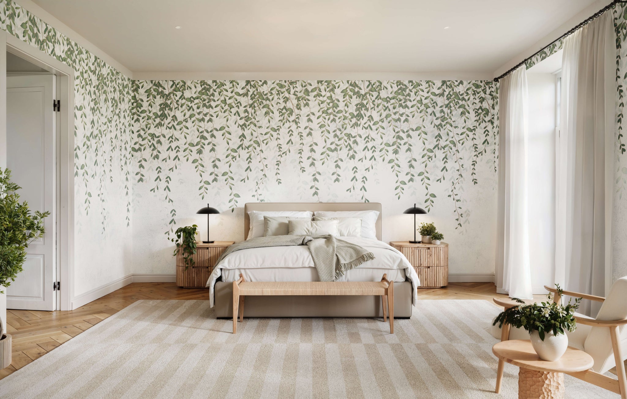 Add a touch of intrigue with 'Bowden' our hanging plant wallpaper mural. Plants within the home are proven to help relieve stress, boost creativity, productivity, and focus. So why not pair your leafy friends with a wallpaper that helps to transport you to a lush paradise. Soft greens are paired with a soft beige textured background to bring the essence of a mediterranean wall. Adding an extra sensory dimension to the design and making that little bit more charming.