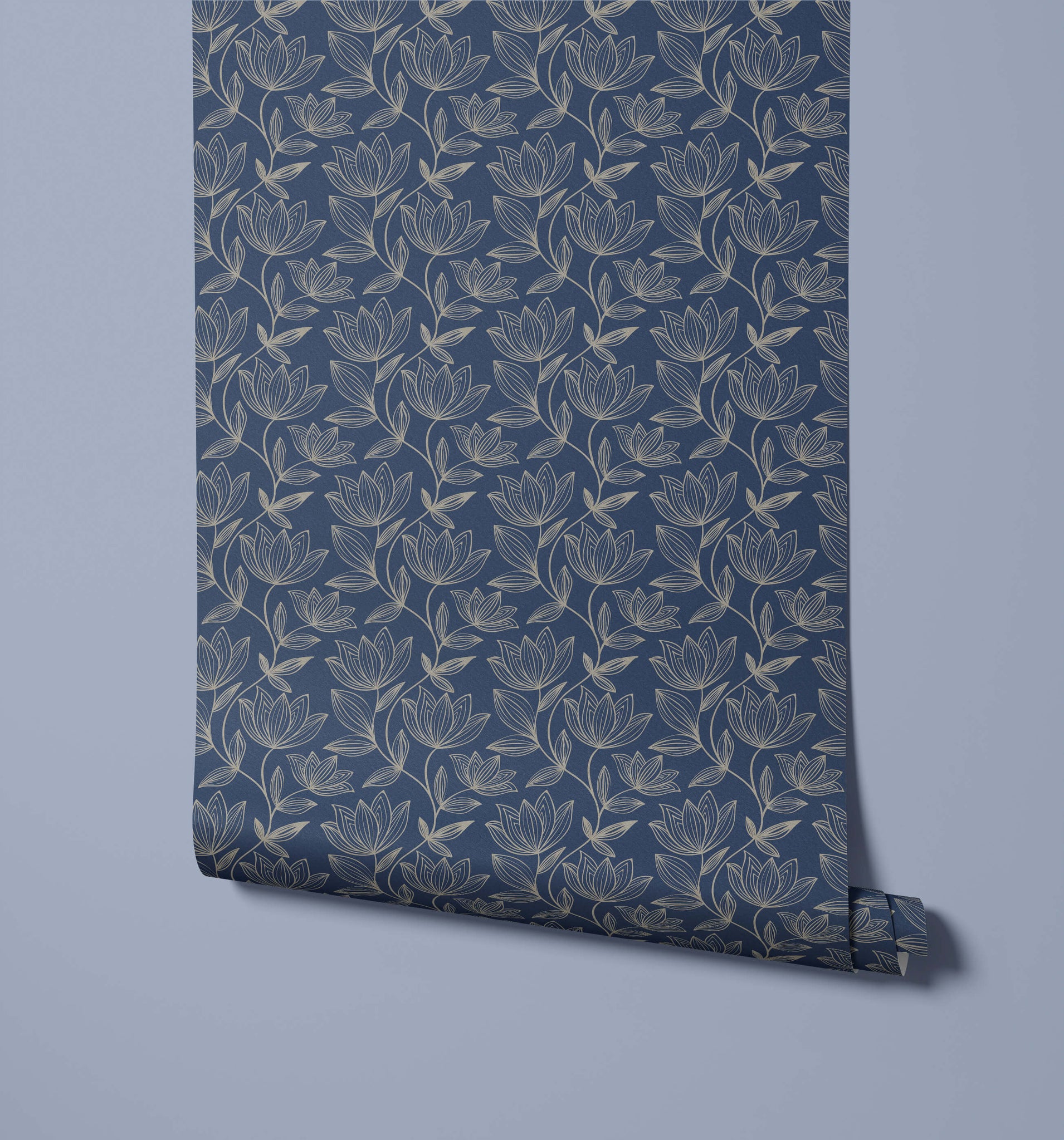 The line art lotus wallpaper is a beautifully serene and detailed design that celebrates the elegant form of the lotus flower through refined illustration. The pattern consists of delicate, continuous outlines of stylized lotus blossoms and intertwining stems, creating a complex yet airy botanical network. The entire design has an etched quality, where the fine drawing contrasts gently with the deep background tone.