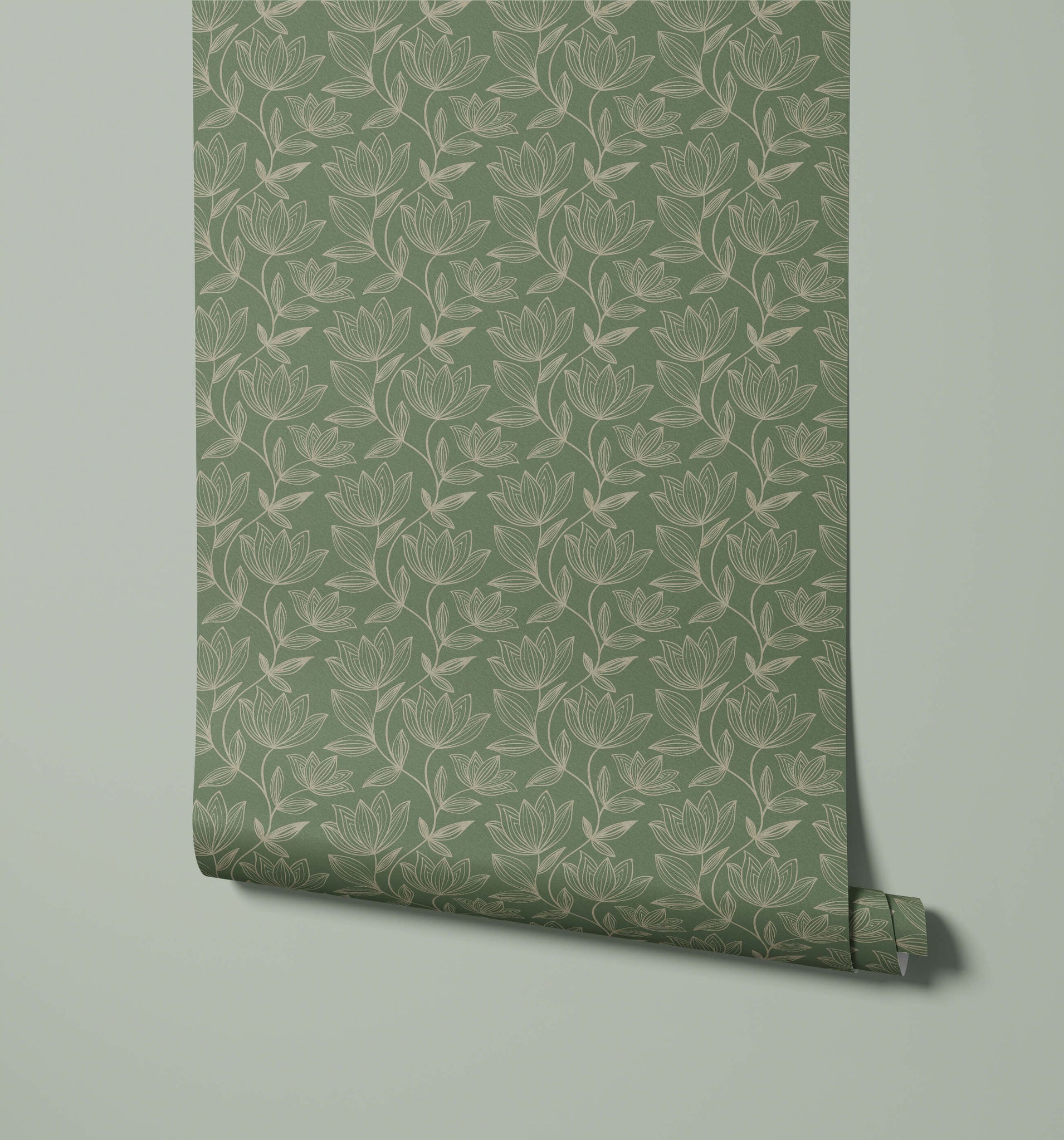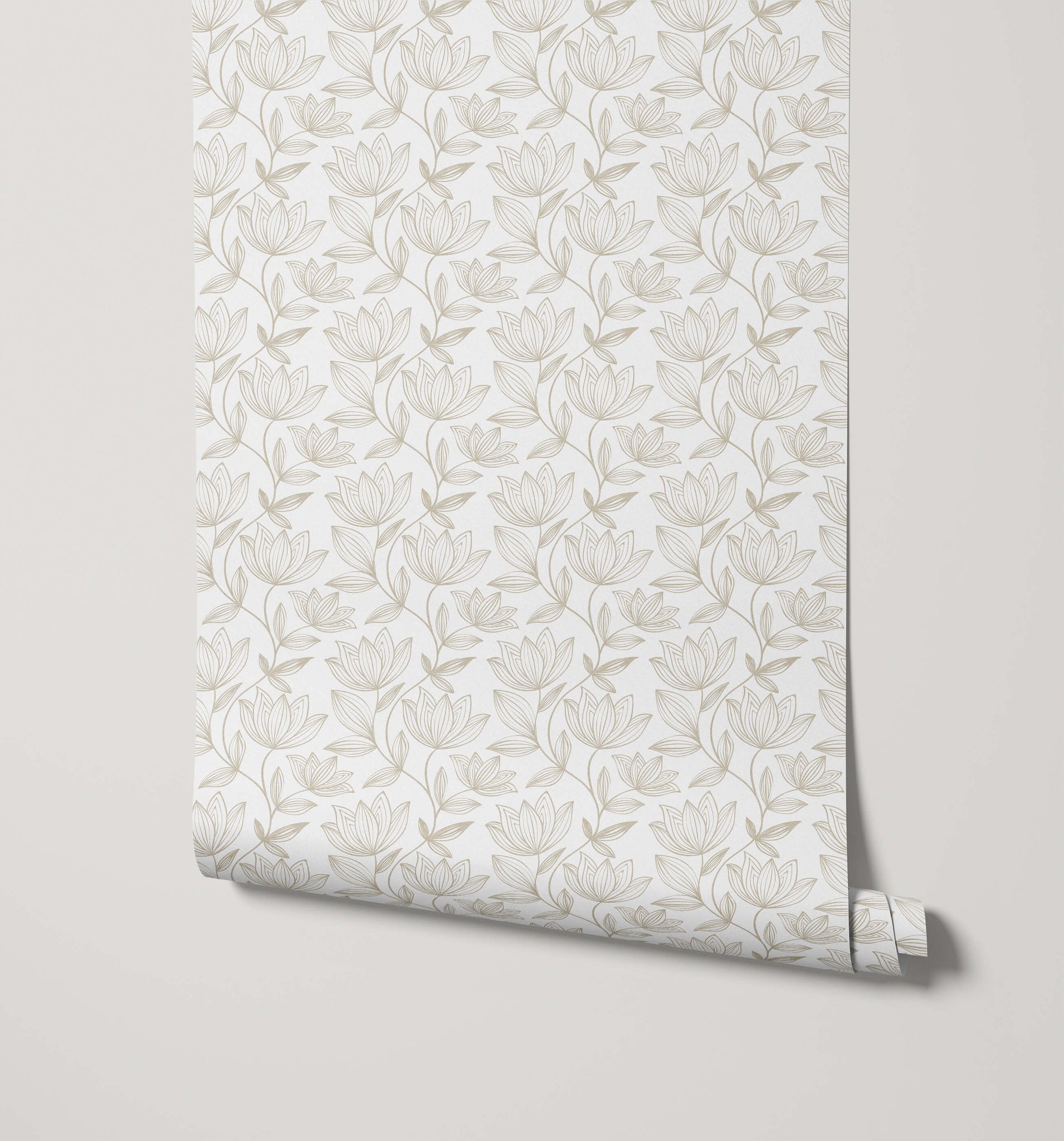 The subtle execution of the line art lotus wallpaper ensures that the visual impact is sophisticated and not overpowering. The continuous, undulating flow of the stems and flowers lends a natural, calming movement to the wall surface, making it an ideal choice for creating a tranquil and thoughtful atmosphere. This design is perfect for adding graceful definition and an artistic touch to bedrooms, dining rooms, or spaces dedicated to relaxation.