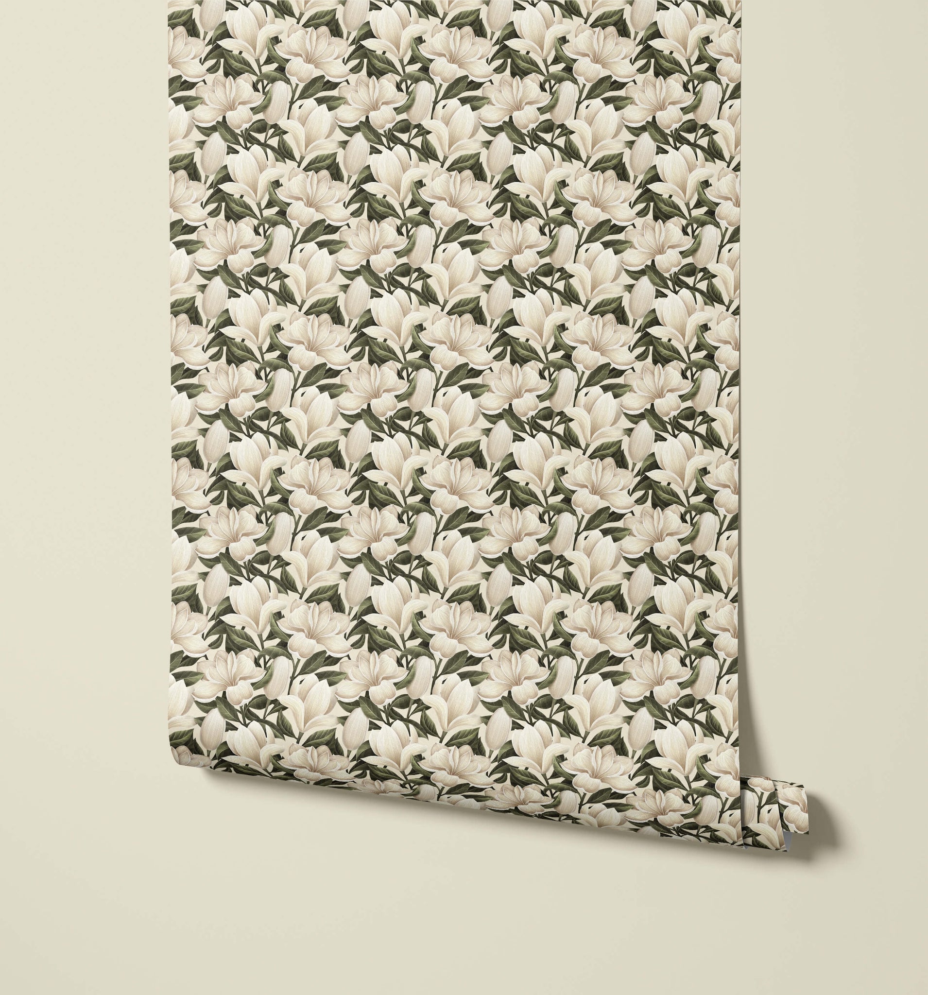 The magnolia floral wallpaper is a dense and opulent botanical design, celebrating the dramatic beauty of the fully opened magnolia flower. The pattern features a highly intricate, repeating motif of large, creamy blossoms intertwined with deep, rich foliage. This tight arrangement completely covers the wall surface, creating a fabric-like tapestry of flora and leaves that feels both abundant and traditionally elegant.