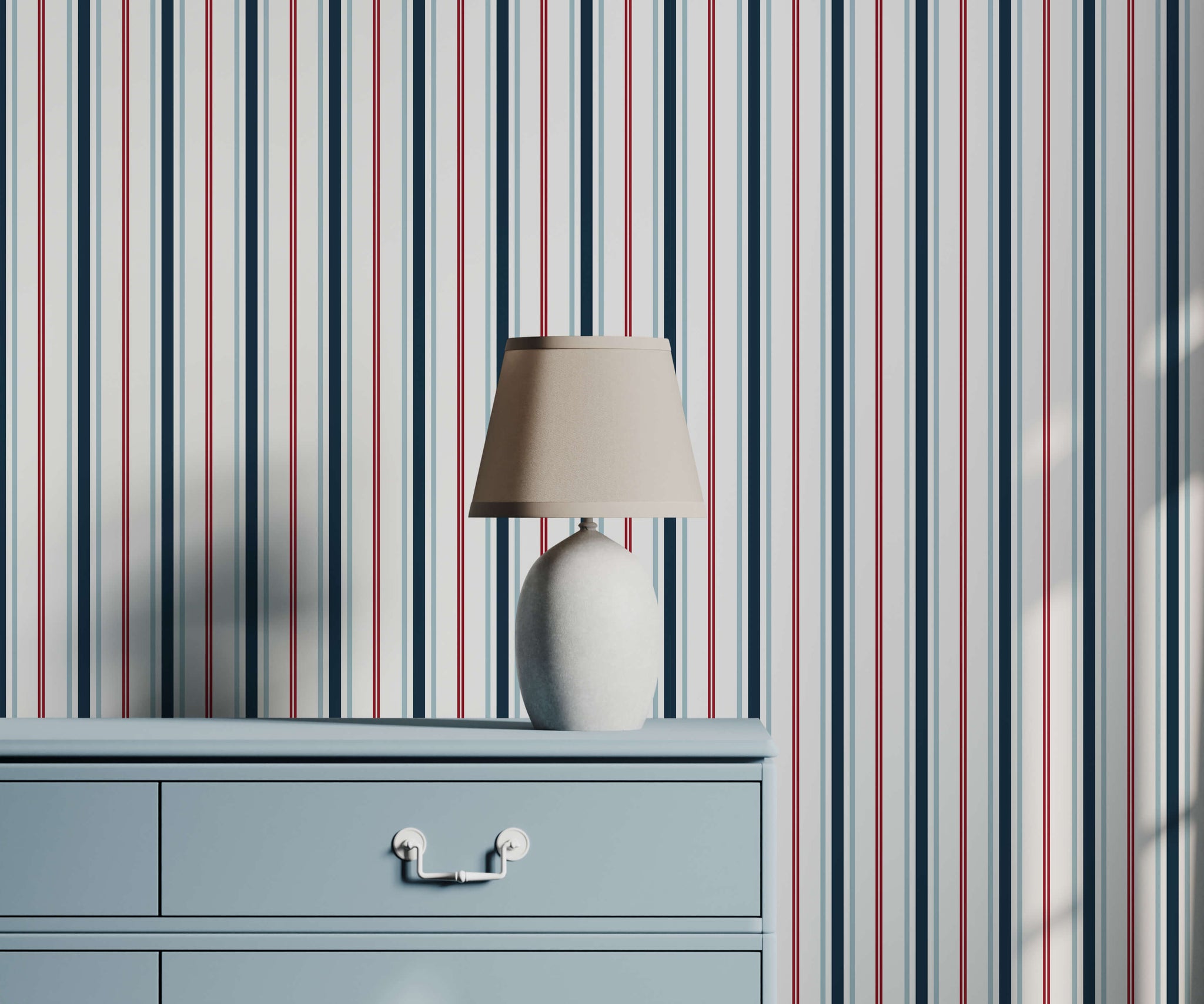 The nautical stripe wallpaper offers a fresh, spirited take on the classic linear pattern, creating an immediate sense of tailored coastal style. The design features multiple fine vertical lines grouped closely together, where the combination of the lines creates a distinct and structured rhythm across the wall. The varied widths and tones of the stripes add visual complexity and a layered, dynamic quality.