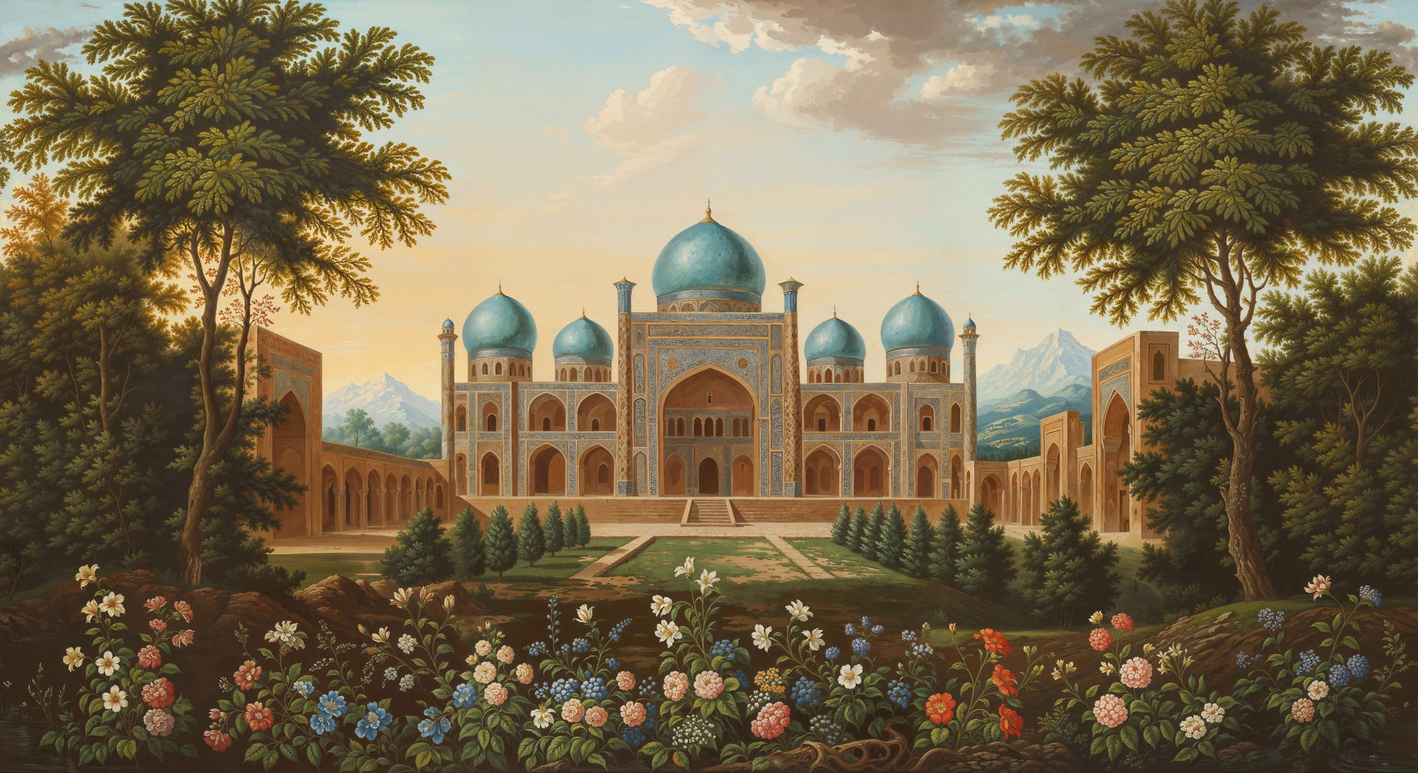 This stunning wallpaper mural captures the majestic serenity of a classical Persian estate, centered around a grand palace with brilliant turquoise domes and intricate mosaic facades. Framed by towering, verdant trees and the distant, snow-capped peaks of a mountain range, the scene is bathed in the soft, golden light of a perennial afternoon. The foreground is a vibrant celebration of nature, featuring a dense tapestry of meticulously painted wildflowers in shades of blush, cream, and sky blue. This panoramic view creates a sense of profound depth and architectural wonder, turning any wall into a gateway to an ancient, sun-drenched paradise.