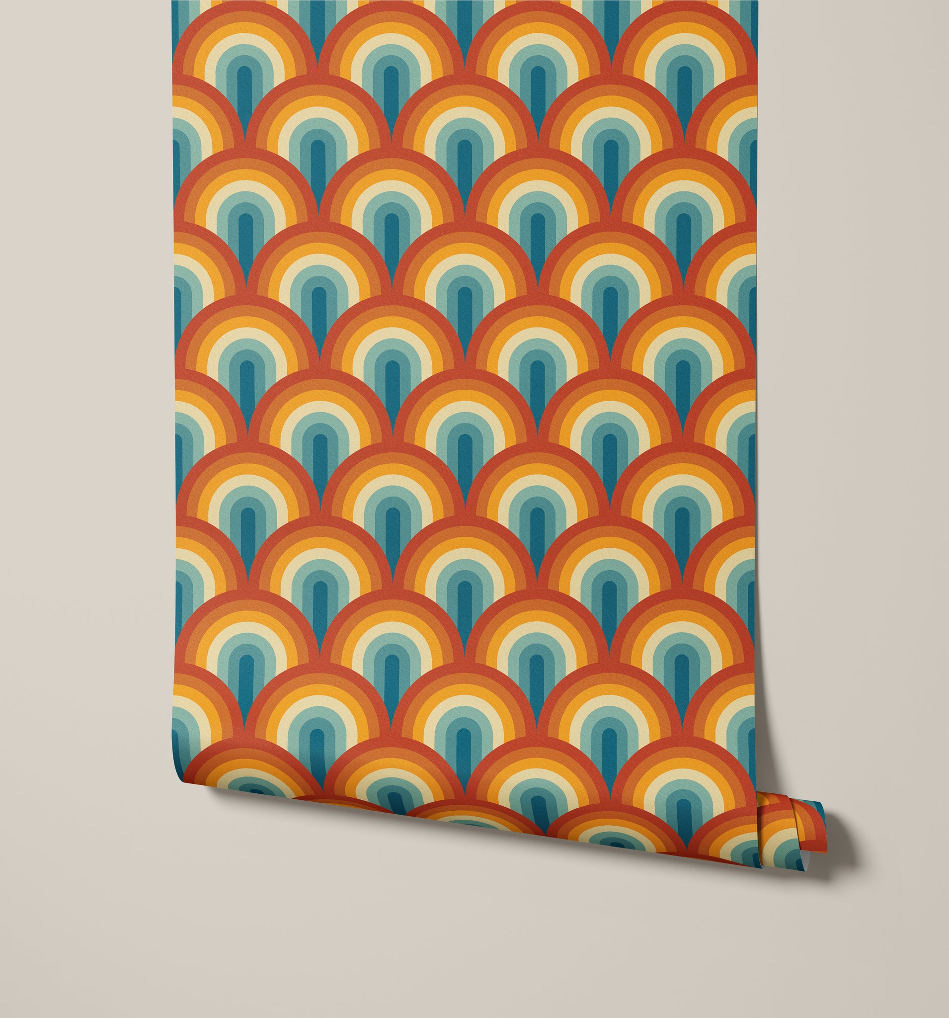 Our retro rainbow wallpaper features classic scallop motifs in choice of pastel or bold colours. This design will create a stunning feature wall or works well across all walls for maximum impact.