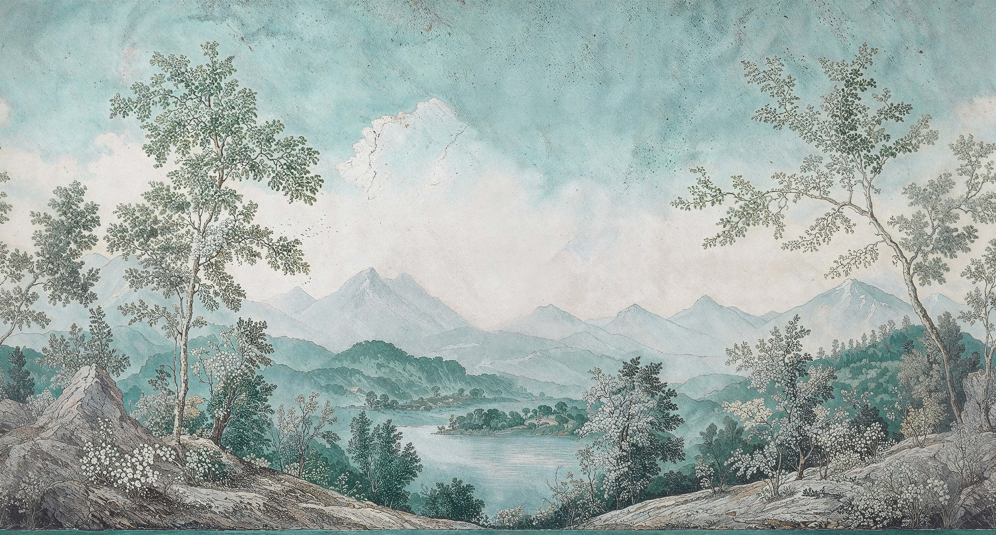 The tranquil lake wallpaper invites you into a serene and picturesque landscape where calm waters rest peacefully amid softly rolling hills and distant mountains. Framed by delicate trees, the lake reflects the gentle light of the sky, creating a scene of quiet beauty and natural balance. The soft silhouettes of mountain peaks rise in the background, adding depth and a sense of timeless grandeur, while the lush greenery and scattered wildflowers in the foreground bring an air of freshness to the scene. This mural captures the essence of tranquillity, with every element combining to evoke a peaceful, almost meditative atmosphere. The overall effect is one of calm immersion in nature, as though gazing out onto a hidden lakeside retreat far from the hustle of everyday life. The tranquil lake wallpaper is perfect for creating a soothing and reflective environment, ideal for spaces where relaxation and a connection to nature are desired. This mural transforms your interior into a haven of quiet serenity and understated natural beauty.