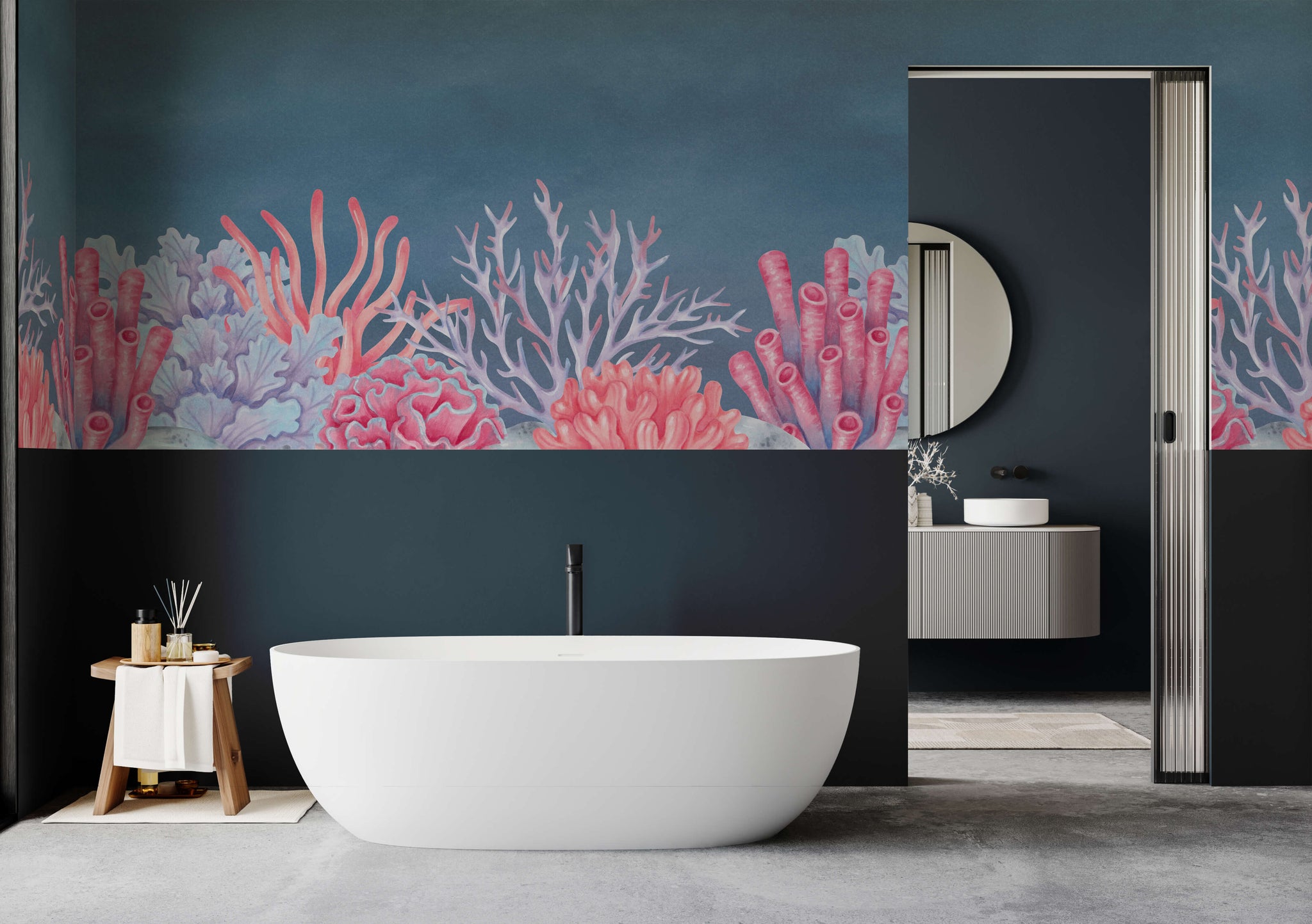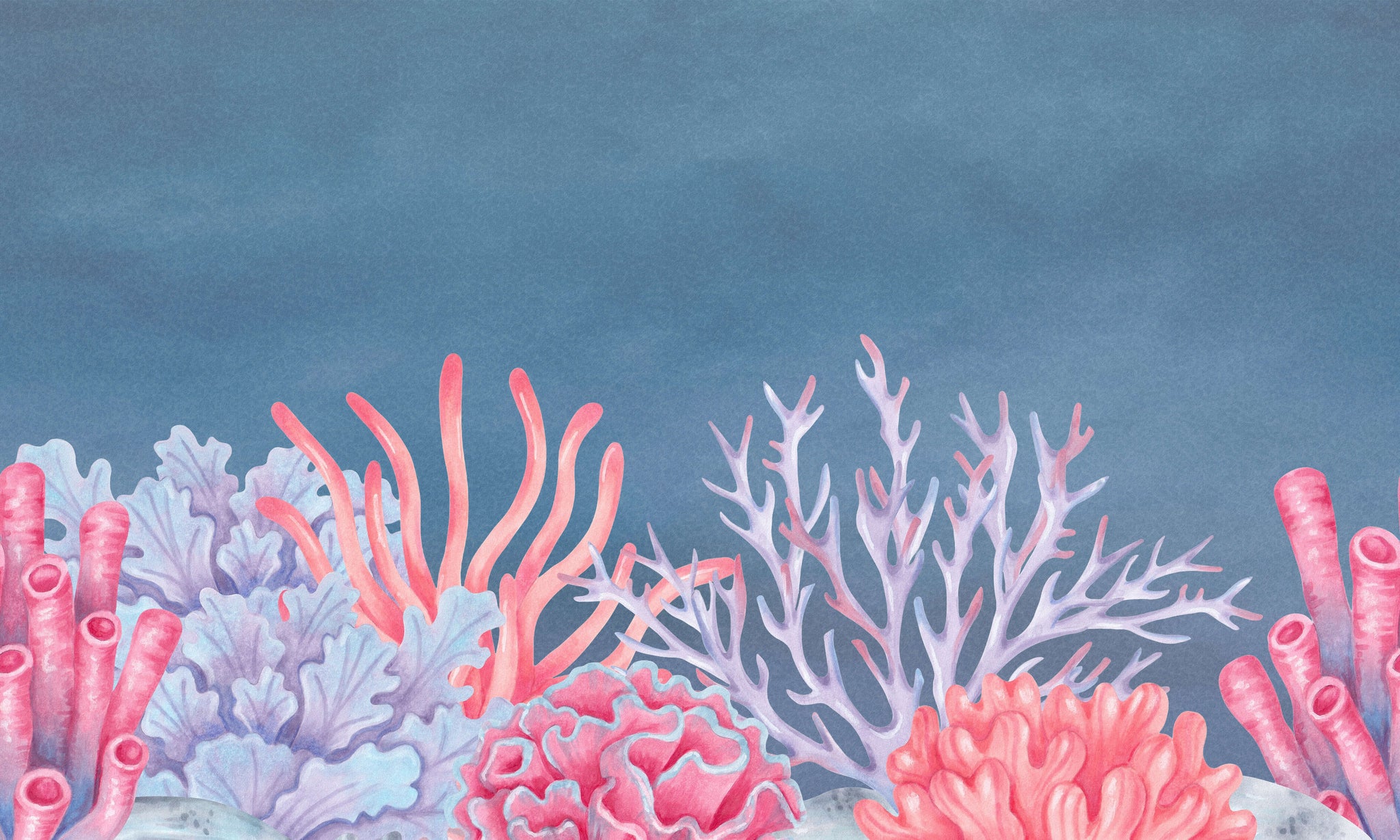 This watercolor mural captures the delicate beauty of a vibrant coral reef, featuring an array of hand-painted marine textures in a soft, dreamy palette. Lush sea fans in lavender and dusty rose intertwine with intricate brain corals and swaying sea plumes in warm salmon tones. The organic, fluid lines of the aquatic life are grounded by a deep, atmospheric blue-grey backdrop that evokes the quiet stillness of the open ocean. This rich contrast ensures the pastel corals pop with artistic clarity, transforming any flat surface into a layered, immersive window into a hidden underwater garden.