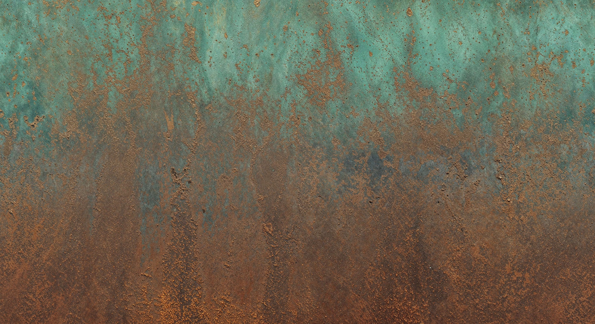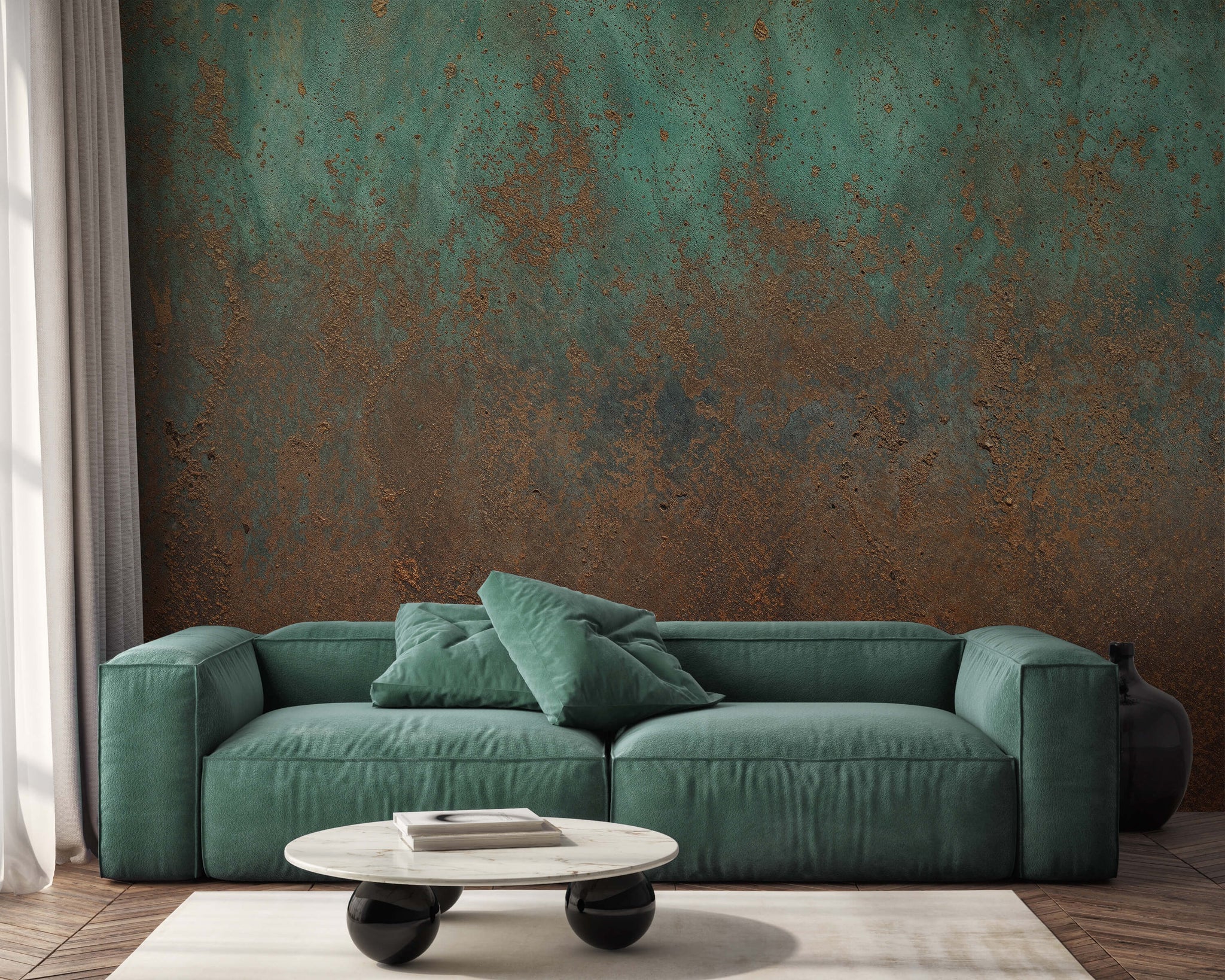 The intricate detail of oxidised surfaces is beautifully recreated, giving the impression of corroded metal transformed into an artful statement. Its colour palette – from deep emeralds to warm rusts – brings a dynamic energy to your room, while still maintaining a sense of organic calm. This mural pairs effortlessly with natural wood, leather, or minimalist furnishings, allowing you to craft a space that feels modern yet timeless.